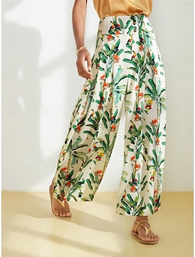 نسائي بنطال واسع الساق مكتمل الطول ساتان ساق عريضه طباعة مرن نسبياً العطلة بنطلونات عطلة أخضر للربيع والصيف S M L