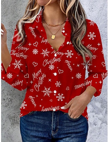 عيد الميلاد المجيد نسائي قميص الرسم أحرف ندفة ثلجية عتيق يوميا أنيق كم طويل قبعة القميص قمصان عادية عمل مناسب للبس اليومي Buttons طباعة أحمر الخريف الشتاء