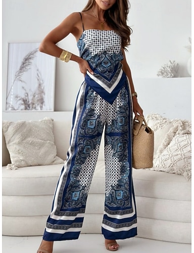 نسائي موضة أناقة الشارع يوميا قميص قصير بنطال واسع الساق بدون كم مع حمالة ورد بدون ظهر طباعة فضفاض مناسب للبس اليومي أسود أزرق البحرية أزرق سماوي الصيف عادي