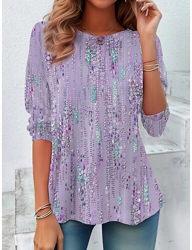 تي شيرت نسائي بأكمام طويلة رسوم جرافيكية هندسية مخططة عتيقة أنيقة كلاسيكية بأكمام طويلة بياقة مستديرة بلون ساج أخضر أحمر بنفسجي لخريف وربيع وما قبل الخريف