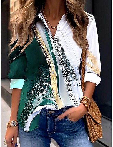 قميص نسائي بأكمام طويلة بلوزة بأزرار طباعة جرافيك أومبري رخامية يومية أنيقة كولار tops طويلة عادية طباعة أزرار خضراء صيفية ربيعية