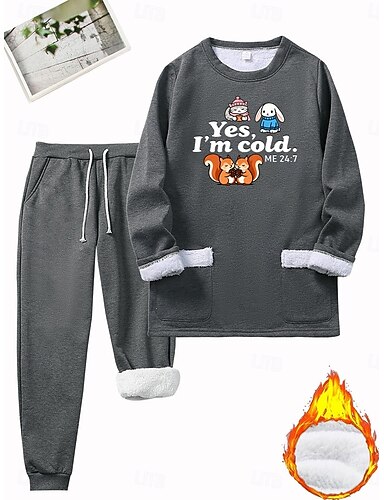 طقم بيجامات نسائي مبطن بالصوف أنيق دافئ موضة من قطعتين طقم بنطال رياضي بأكمام طويلة قبة مستديرة طباعة حرف رسومي في الهواء الطلق إجازة يومية وردي وردي داكن أزرق ربيع