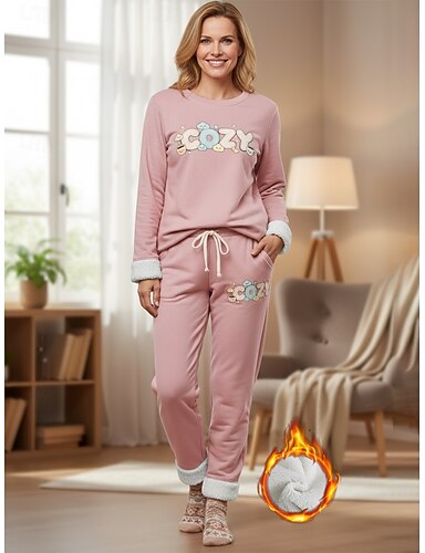 طقم بيجامات نسائي مبطن بالصوف أنيق دافئ موضة من قطعتين طقم بنطال رياضي بأكمام طويلة أكمام أسقف قبة مستديرة طباعة حرف رسومي في الهواء الطلق إجازة يومية أسود وردي وردي داكن ربيع