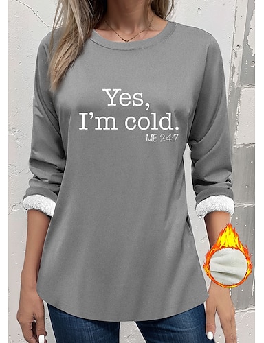 سترة نسائية مبطنة بالصوف، بيجامة، رسالة "نعم أنا بارد"، دافئة وناعمة، بأكمام طويلة، رقبة دائرية، ياقة دائرية، قمصان طويلة، رياضية غير رسمية، أسود، أصفر، وردي، أزرق، رمادي، خريف وشتاء