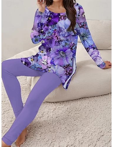 طقم بيجامة نسائي ملابس منزلية طوق مستدير أكمام طويلة عصرية طقم سراويل مطبوعة زهور يوميًا أبيض عنب بنفسجي مقاس عادي