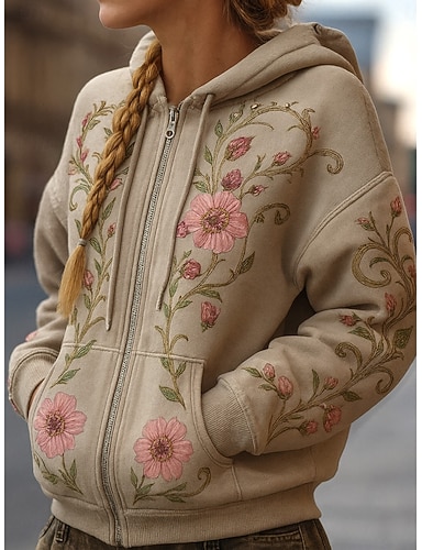 نسائي هوديس بسحاب ورد الرسم أنيق دافئ عتيق كم طويل مع قبعة قمصان عادية شارع مناسب للبس اليومي بقع سحاب جيب أخضر كاكي الربيع الخريف
