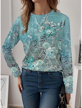 تي شيرت نسائي بأكمام طويلة ياقة دائرية تونك مع رسومات زهور غير رسمية عادية طباعة يومية بيضاء سوداء سوداء زرقاء برتقالية بنية ربيع خريف ما قبل الخريف