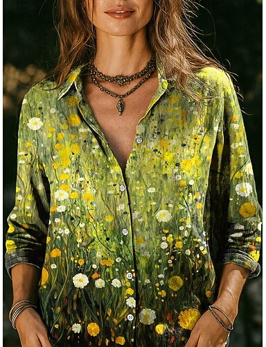بلوزة نسائية قميص زر أسفل قميص تونك طوق طويل الأكمام أزياء زهور طباعة عادية عادية للعيد زرقاء خضراء كاكي ربيع وخريف