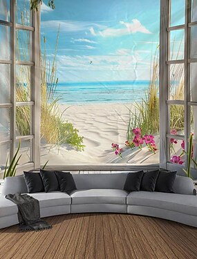 نافذة عرض الشاطئ، نسيج معلق، جدار فني كبير، نسيج جدارية، ديكور صورة خلفية، ستارة بطانية، غرفة نوم المنزل، غرفة المعيشة، ديكور المحيط، الصيف