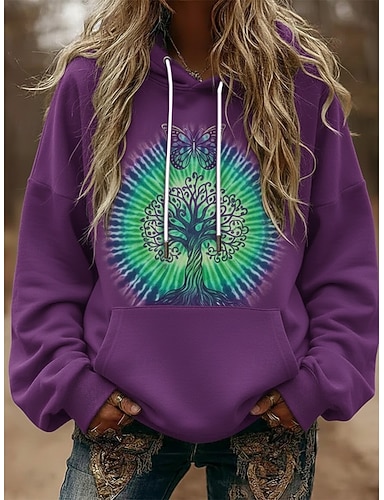 نسائي Pullover كنزات بقبعة ورد عتيق أناقة الشارع كاجوال كم طويل مع قبعة قمصان عادية مناسب للبس اليومي فضفاض الرياضة رباط جيب طباعة أزرق أرجواني الربيع الخريف