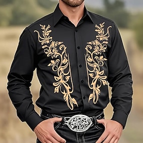 رجالي انتقل طباعة زهور عرقي قميص القميص الغربي قميص كاوبوي كم طويل ريترو خمر الأماكن المفتوحة فضفاض ملابس عمل الصيف الربيع الخريف طوي جيبان أماميان قمصان بأزرار أسود بني