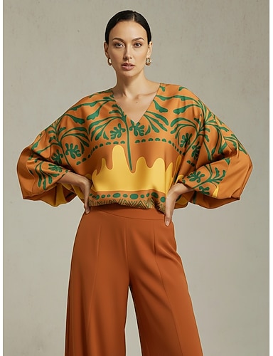 بلوزة نسائية من الساتان الكاكي بطبعة زهور للعطلات بأكمام واسعة ورقبة على شكل حرف V مناسبة للربيع والخريف كاجوال