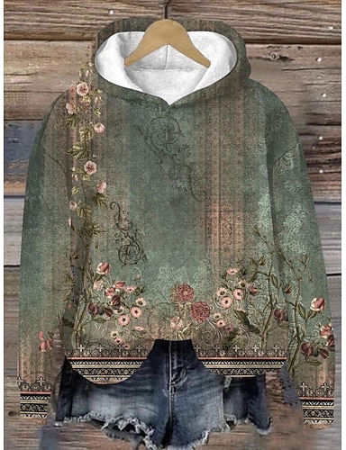هودي بوهو عتيق مطبوع بتقنية ثلاثية الأبعاد للنساء، هودي باتشورك، سويت شيرت مزهر، سويت شيرت أنيقة دافئة نشطة، هودي، ملابس شارع، يومية، باتشورك مطبوع، بنفسجي فاتح، بني، أخضر، الربيع، الخريف، الشتاء