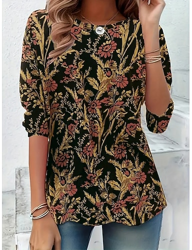 بلوزة نسائية بأكمام طويلة، مزينة برسومات زهور، بوهيمية، يومية، إثنية، بأكمام بطول 3/4، ياقة مدورة، ياقة قارب، tops اليومية، إجازة، طباعة سوداء، حمراء، برتقالية، بيج، صيفية، ربيعية