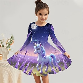 الفتيات 3D الرسم كارتون آحادي القرن فستان كم طويل طباعة ثلاثية الأبعاد الصيف الخريف عطلة الرياضة & في الخارج مناسب للبس اليومي لطيف كاجوال جميل أطفال 3-12 سنة لباس غير رسمي فستان شكل حرف A فوق الركبة