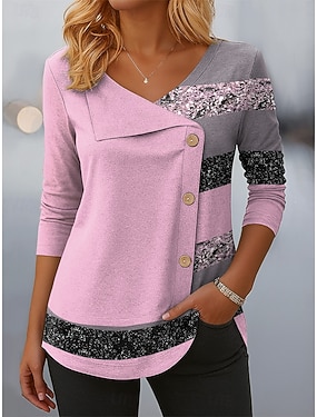 نسائي تي شيرت الرسم مخطط عتيق أنيق الحديث كم طويل رقبة عالية مدورة رقبة دائرية قمصان عادية مناسب للبس اليومي Buttons طباعة متدرجة وردي بلاشيهغ الربيع الخريف الشتاء