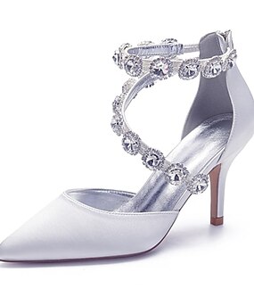 حذاء نسائي بكعب ستيليتو بمقدمة مدببة من الجلد اللامع باللون الأبيض مع حزام من اللؤلؤ - حذاء أنيق للحفلات الراقصة والحفلات وحفلات الزفاف