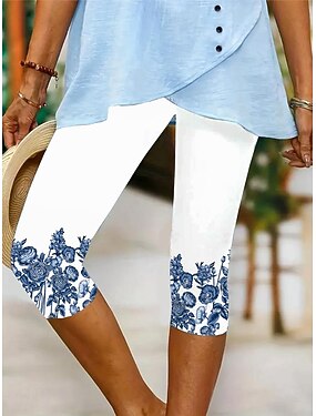 بنطلون ليغينغز نسائي كابري عالي المرونة عطلة أزياء عتيقة حتى منتصف الساق خصر متوسط الطول طباعة زهور رسومية قابلة للتنفس ناعمة عطلة غير رسمية يومية بلون أزرق بيضة روبن أسود أزرق داكن أزرق فاتح