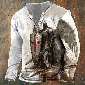 رجالي Halloween فرسان الهيكل مسيحي تي شيرت قميص هينلي كم طويل طباعة ثلاثية الأبعاد مصمم عتيق / معتق شارع فضفاض مناسب للبس اليومي الصيف الربيع الخريف أبيض كاكي هينلي تي شيرت هنلي