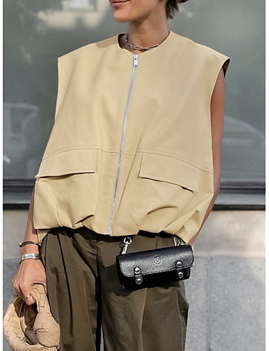 نسائي سترة مريح متنفس سحاب جيب كاجوال سهل عطلة شارع فضفاض مناسب للبس اليومي سحاب قصيرة V رقبة عادي بدون كم ملابس خارجية كاكي الصيف الربيع