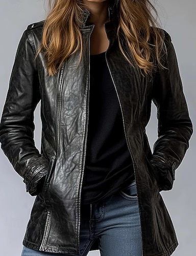 نسائي جواكيت جلد الدفء مريح سحاب جيب كاجوال سهل عطلة مناسب للخارج عطلة نهاية الاسبوع عادية مرتفعة عادي كم طويل ملابس خارجية أسود الخريف الشتاء