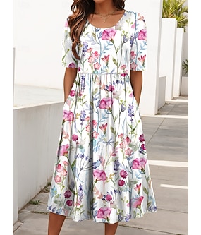 فستان نسائي ميدي فستان عادي فستان تي شيرت فستان تي فستان shift بطبعة زهور بيضاء خضراء رمادية بأكمام قصيرة ربيعية صيفية برقبة على شكل V أساسية يومية إجازة عطلة نهاية الأسبوع