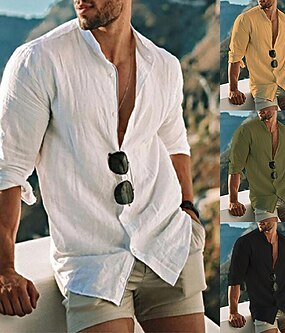 رجالي قميص قميص كتان قميص بياقة الفرقة قميص صيفي ملابس الشاطئ زر حتى القميص لون الصلبة الأماكن المفتوحة عطلة أسود أبيض أصفر أخضر فاتح كم طويل قبة الربيع الخريف ملابس
