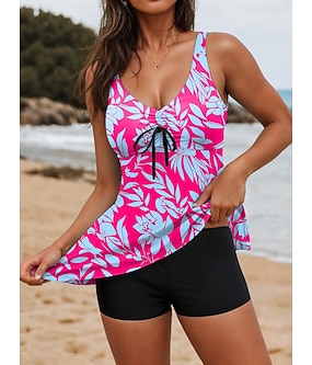 ملابس السباحة النسائية تانكيني قطعتين ، ملابس سباحة بوي ليج بلا ظهر مع تحكم في البطن وخصر عالٍ ، ملابس عطلة على الشاطئ بزهور على شكل حرف U وبدون أكمام