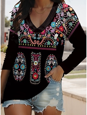 تي شيرت نسائي بحجم زائد بياقة V بأكمام طويلة وعرضة رسومات هندسية عتيقة بسيطة عرقية طويلة طباعة يومية لعطلة نهاية الأسبوع زرقاء كاكي خريفية وشتوية