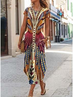 نسائي فستان طويل فستان بيزلي لباس غير رسمي فستان طويل فستان خفيف عرقي قبلي عطلة شارع مناسب للعطلات عادي زخرفات كم قصير رقبة عالية مدورة أحمر أزرق أرجواني برتقالي الصيف
