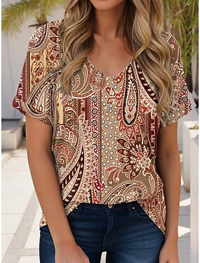 تي شيرت نسائي من نمط البوهو بلوزة مزينة بنقوش حيوانية هندسية عتيقة غير رسمية بأكمام قصيرة برقبة على شكل V بمقاسات منتظمة طباعة يومية ملابس للشاطئ باللون الأحمر والأزرق والبرتقالي لفصل الصيف