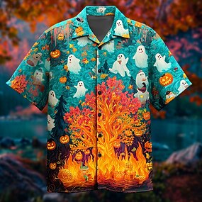 Halloween رجالي قرع شبح كوستيوم هالوين قميص القميص الكوبي زر حتى القميص كم قصير الطراز القوطي الداكن مناسب للعطلات الصيف قميص بياقة المخيم طباعة ثلاثية الأبعاد أزرق