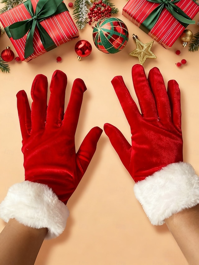 قفازات مخملية نسائية لعيد الميلاد مع أطراف من الفرو الصناعي، قفازات حمراء للعطلات للاحتفالات الاحتفالية، مثالية لحفلات الشتاء ومناسبات عيد الميلاد#10311191