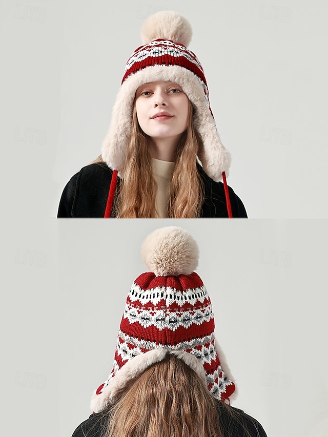 قبعة شتوية محبوكة مع بوم بوم وبطانة من الفرو الصناعي - قبعة دافئة بغطاء للأذن للنساء#10593890