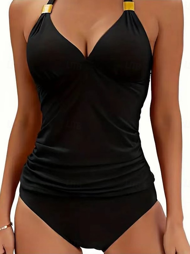 تانكيني نسائي مكون من قطعتين ملابس السباحة بكسرات ضيقة تحكم في البطن عالية الخصر ضيقة بدون ظهر ملابس شاطئ لعطلة بلون سادة رقبة هالتر بدون أكمام #13206449