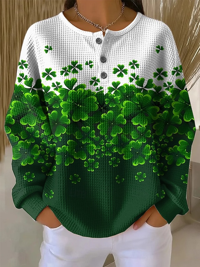 سويت شيرت نسائي من سانت باتريك بمناسبة يوم القديس باتريك برسومات شامروك، دافئ، كلاسيكي، غير رسمي، بأكمام طويلة، رقبة دائرية، أعلى عادي، ملابس يومية، طباعة أزرار، أخضر#14103229
