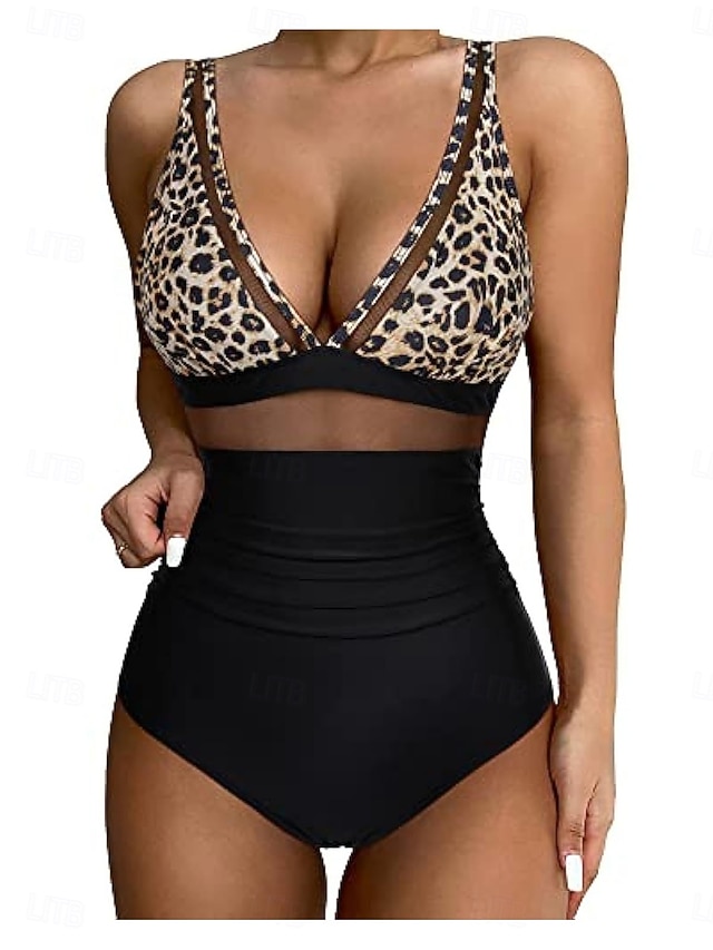 نسائي ملابس السباحة قطعة واحدة ملابس البحر ملابس السباحة شبكة بنطلون رياضي للبطن عالي الخصر ضعيف بدون ظهر العطلة ملابس الشاطئ جلد نمر أوراق V رقبة بدون كم بدلة سباحة #14256212