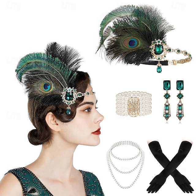 مجموعة مجوهرات نسائية من طراز جاتسبي فلابر من عشرينيات القرن العشرين - عصابة رأس من ريش الطاووس، سوار من اللؤلؤ، أقراط، قلادة، وقفازات للحفلات الكلاسيكية والملابس المسائية#15082896