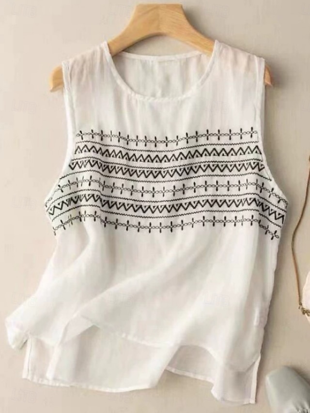 نسائي قميص قمصان قطنية كتان بلوزة كتان قطني صناعي طباعة هندسي أساسي كاجوال بدون كم رقبة عالية مدورة قمصان عادية مناسب للبس اليومي أبيض كاكي رمادي الصيف #19271036