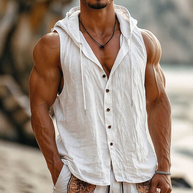 رجالي قميص قميص كتان قميص صيفي ملابس الشاطئ زر حتى القميص قميص مقنع لون الصلبة عطلة شارع أزرق أسود أبيض أخضر بدون كم مع قبعة الصيف الربيع ملابس #19310983