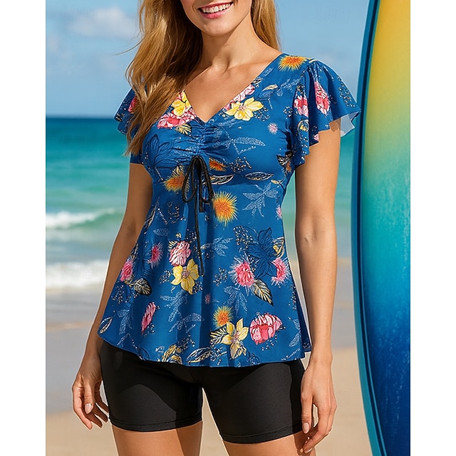 نسائي ملابس السباحة 2 قطعة شورتات قصيرة ملابس السباحة بدون ظهر العطلة ملابس الشاطئ ورد V رقبة بدون كم بدلة سباحة