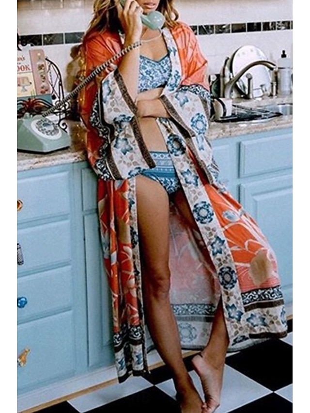 نسائي ملابس السباحة تغطية الجسم ملابس السباحة ربطة عنق أمامية استوائي ملابس الشاطئ زهور دوران رقبة حرف V دائري كم طويل بدلة سباحة #17053786