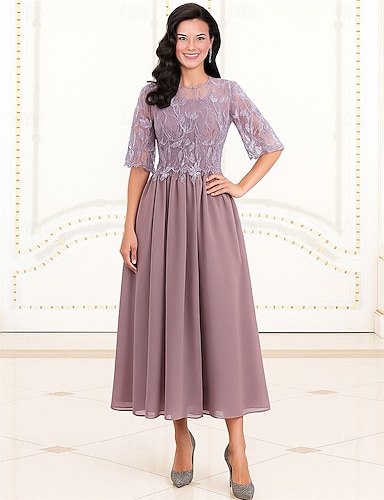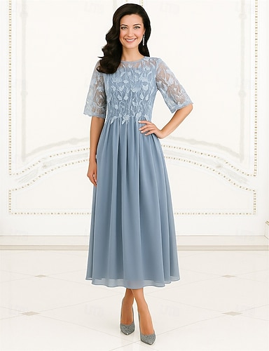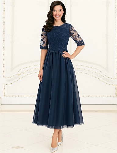 فستان حفلة بطول شاي على شكل حرف A فستان كوكتيل فستان ضيف زفاف فستان والدة العروس بأكمام 3/4 وياقة مستديرة أنيق عتيق رسمي دانتيل مع دانتيل