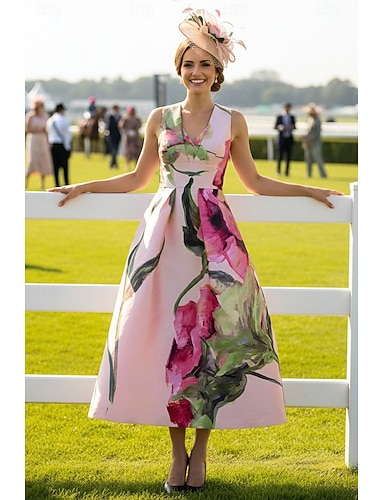 A-الخط طول الكعب فستان ديربي فستان أم العروس بدون كم V رقبة أنيق عتيق كنتاكي ديربي ساتان مع زهور طباعة