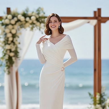 فستان الأم العروس أنيق عنق على شكل V بطول الأرض جيرسي طويل الأكمام مع كشكش