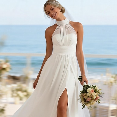 A-الخط متوازي فستان زفاف ضيف فستان أبيض صغير أنيق قطع فساتين بيضاء صغيرة بدون كم الرقبة الرسن حفلة في الحديقة رسمي مع شريطة طيات