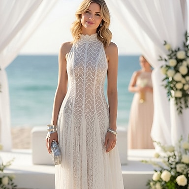 عامودي طول الأرض فستان أبيض فستان أبيض صغير أنيق بدون كم الرقبة الرسن زفاف عيد الحبّ عارية الظهر مع كشاكش