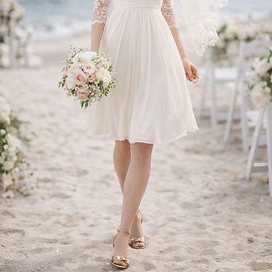A-الخط طول الساق فستان زفاف ضيف فساتين زفاف الضيوف يوميا كم قصير V رقبة حفلة في الحديقة ضيف حفل زفاف مع طيات تفاصيل كريستال