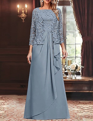 فستان مكون من قطعتين على شكل حرف A للأم العروس فستان مزين أنيق قديم بسيط رقبة دائرية بطول الكاحل من الدانتيل بأكمام طويلة مع تطريز دانتيل