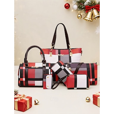 Women's Christmas Plaid Handbag Set, Multi-color Faux Leather Material, Stylish Tote, Crossbody, Wallet & Pouch, Perfect for Holiday Gift and Christmas Party